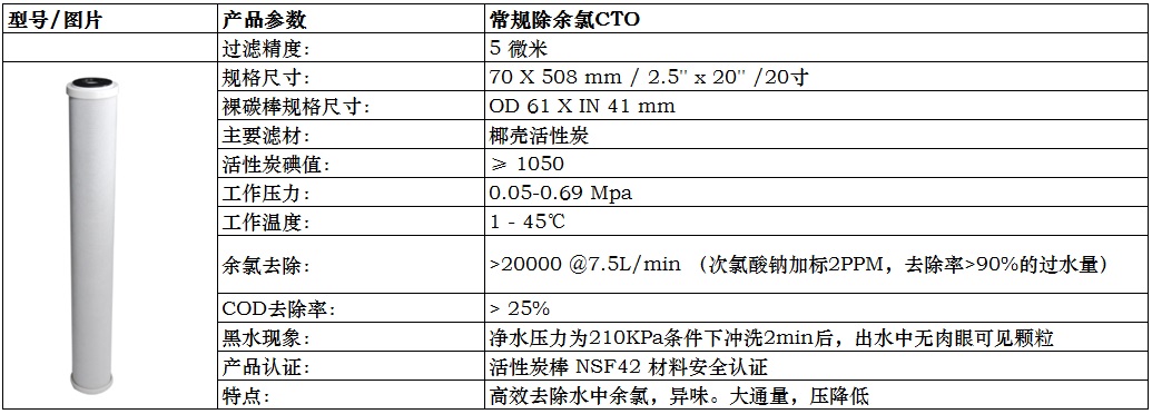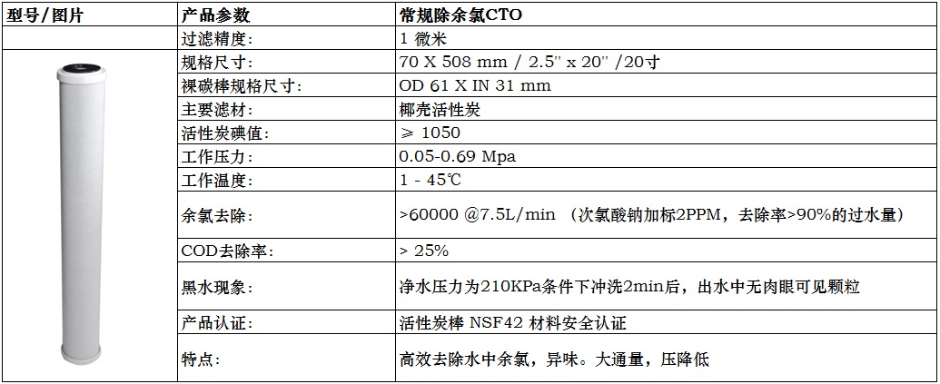 常規(guī)20寸除余氯CTO濾芯,過(guò)濾精度1μm